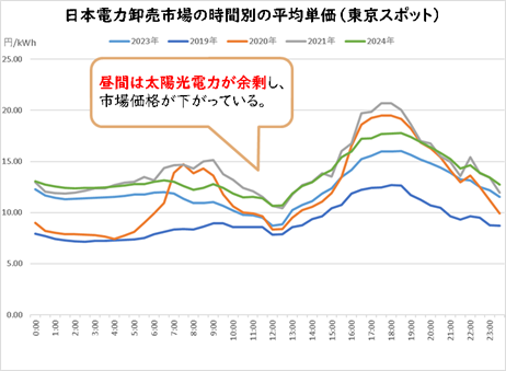 現在の太陽光のFIT価格は下落し、また太陽光発電が発電する時間帯の電力の価値(右グラフ参照)も低下、つまり太陽光発電は高くは売れなくなってきています。