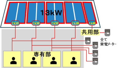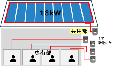 | 自家消費率 | △ 専有部でも太陽光電力を使えるが、各戸で余った電力を融通できないので、余剰電力が出やすい(空室時は全量余剰となる)。 |