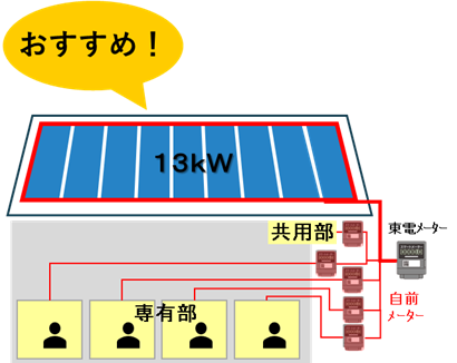 この方式は投資額が最も少なくて済みますが、共用部でしか太陽光電力を使えないので自家消費がほとんどできず、オーナー様の収入が小さくなります。補助金も使えませんので、太陽光発電の投資回収は難しくなります。